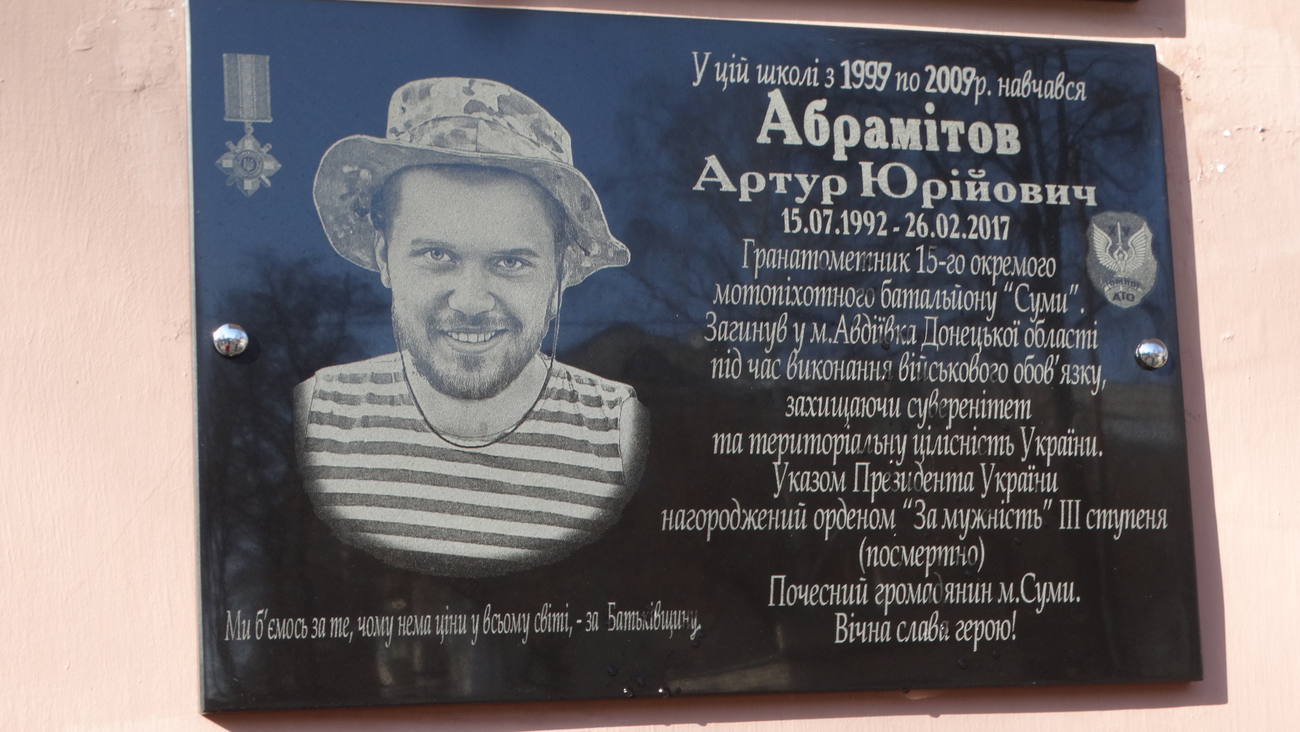 У Сумах установили меморіальну дошку загиблому захиснику України Артуру Абрамітову